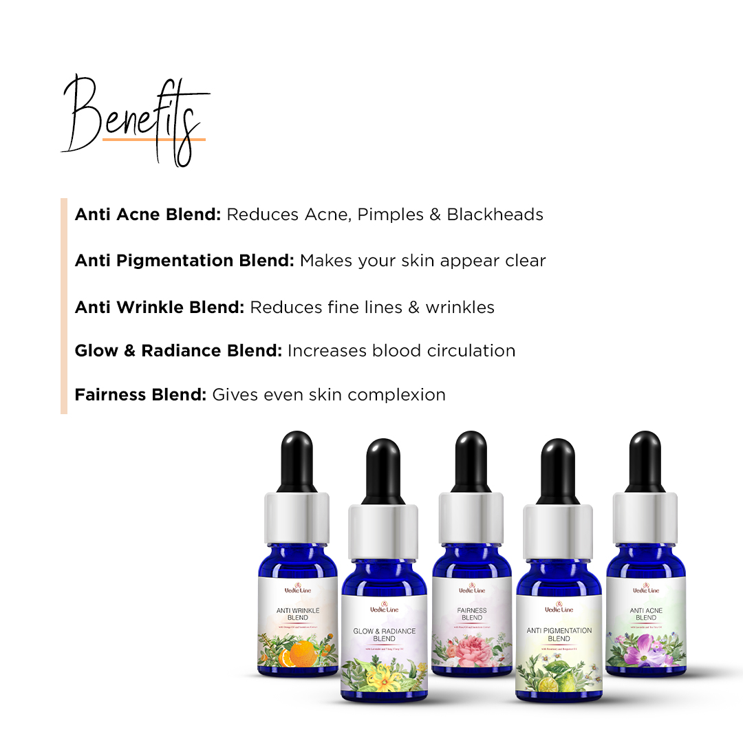 The All-in-One Blends Combo is a carefully curated collection of products designed to address multiple skincare concerns, ensuring a comprehensive approach to achieving healthy and radiant skin. This versatile combo includes five expertly formulated blends: Anti-Pigmentation Blend, Glow & Radiance Blend, Anti-Acne Blend, Anti-Wrinkle Blend, and Fairness Blend (Rose & Sandalwood). Moreover, together, these blends offer an all-inclusive solution that is tailored to meet the diverse needs of your skin.