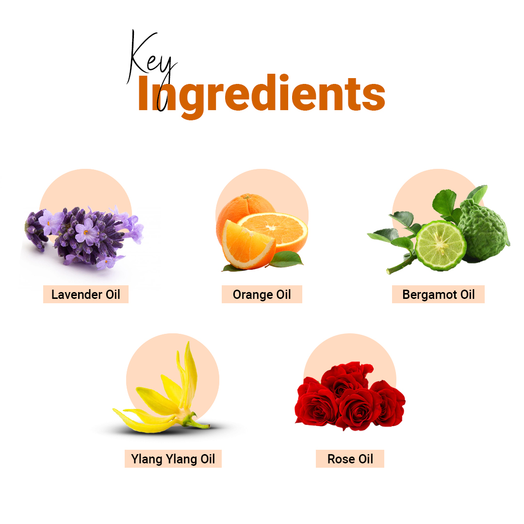 Lavender oil, Orange oil, Bergamot Oil, Ylang Yalang Oil, Rose Oil
