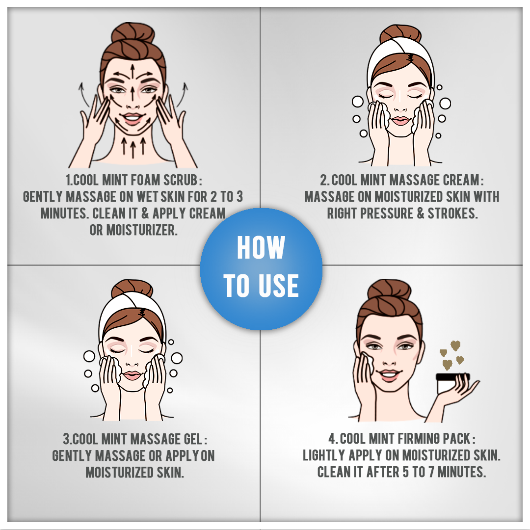 a. With Cool Mint Massage Cream, Massage for 10 to 12 minutes, giving right strokes & pressure. Use Toner or distilled water, while massaging. Wipe it.