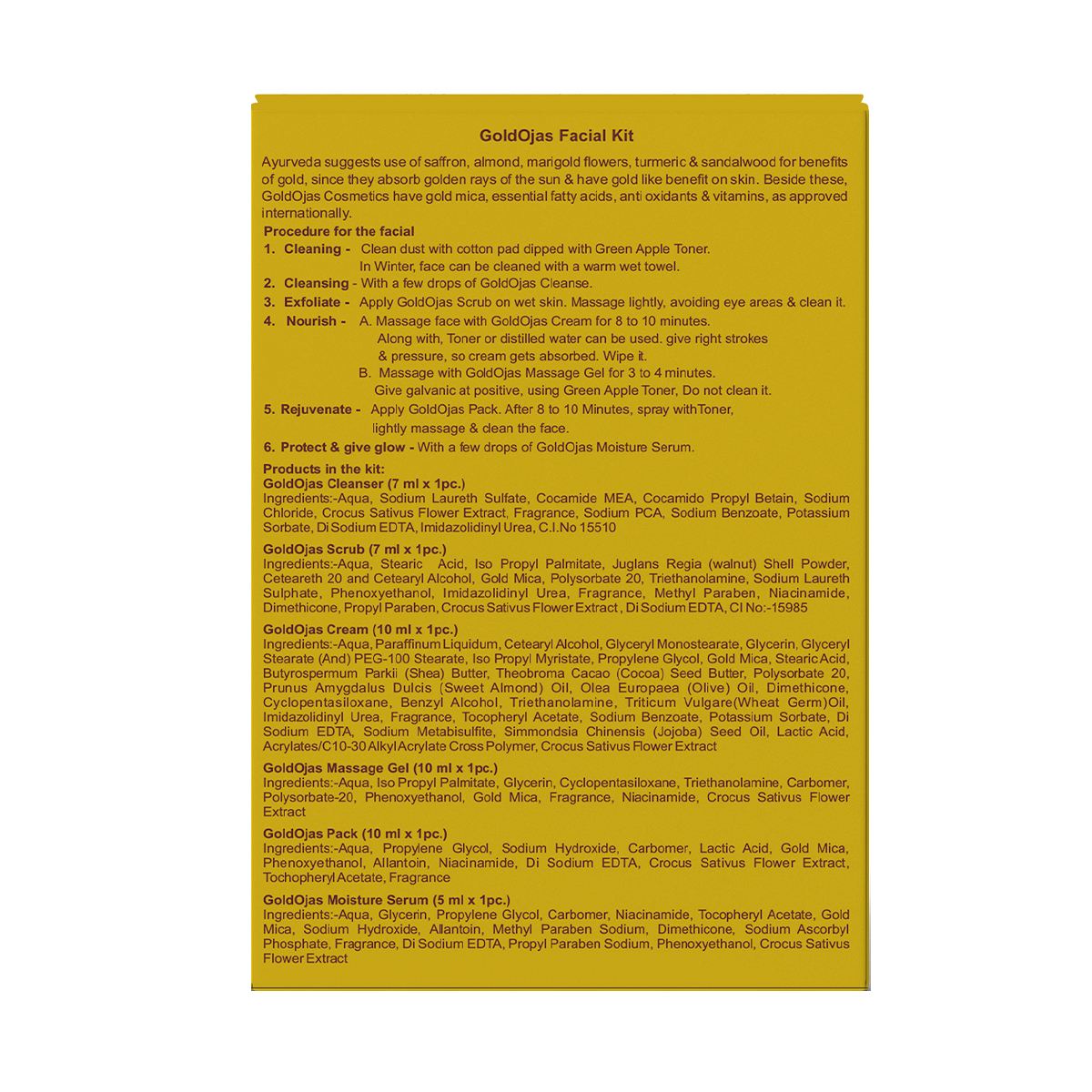 Step 5 : Rejuvenate – Apply GoldOjas Pack, when semi dry, spray Toner, lightly massage & clean it. Spray Toner & Blot it.