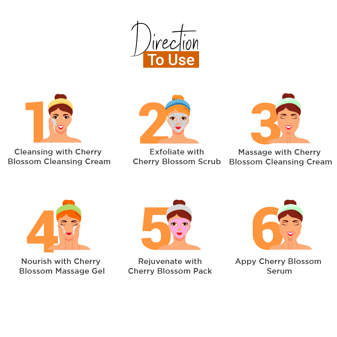 Step 6:- Apply a light layer of Cherry Blossom Serum to damp skin.