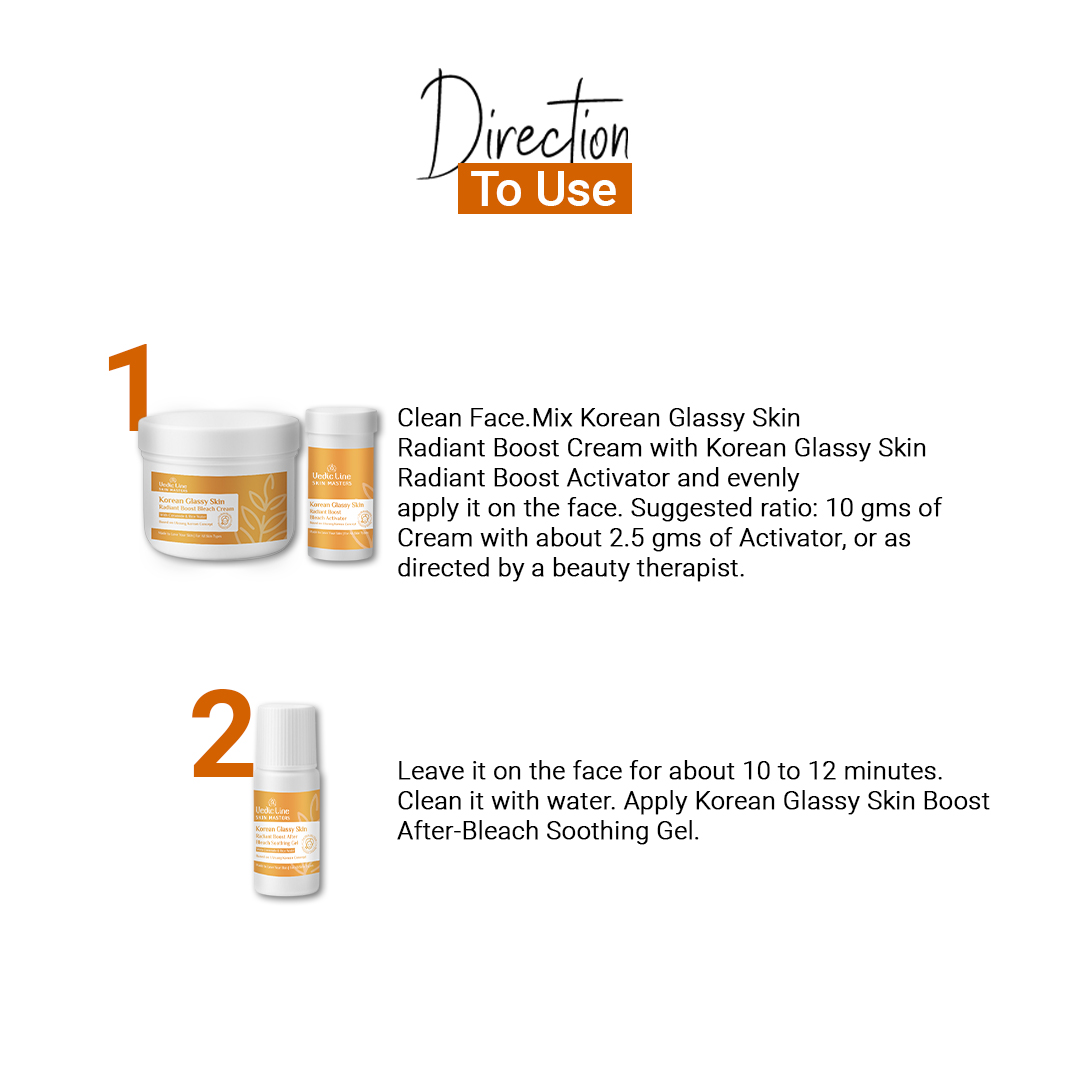Step 2: Mix Korean Glassy Skin Radiant Boost Cream with Korean Glassy Skin Radiant Boost Activator and evenly apply it on the face. Suggested ratio: 10 gms of Cream with about 2.5 gms of Activator, or as directed by a beauty therapist.