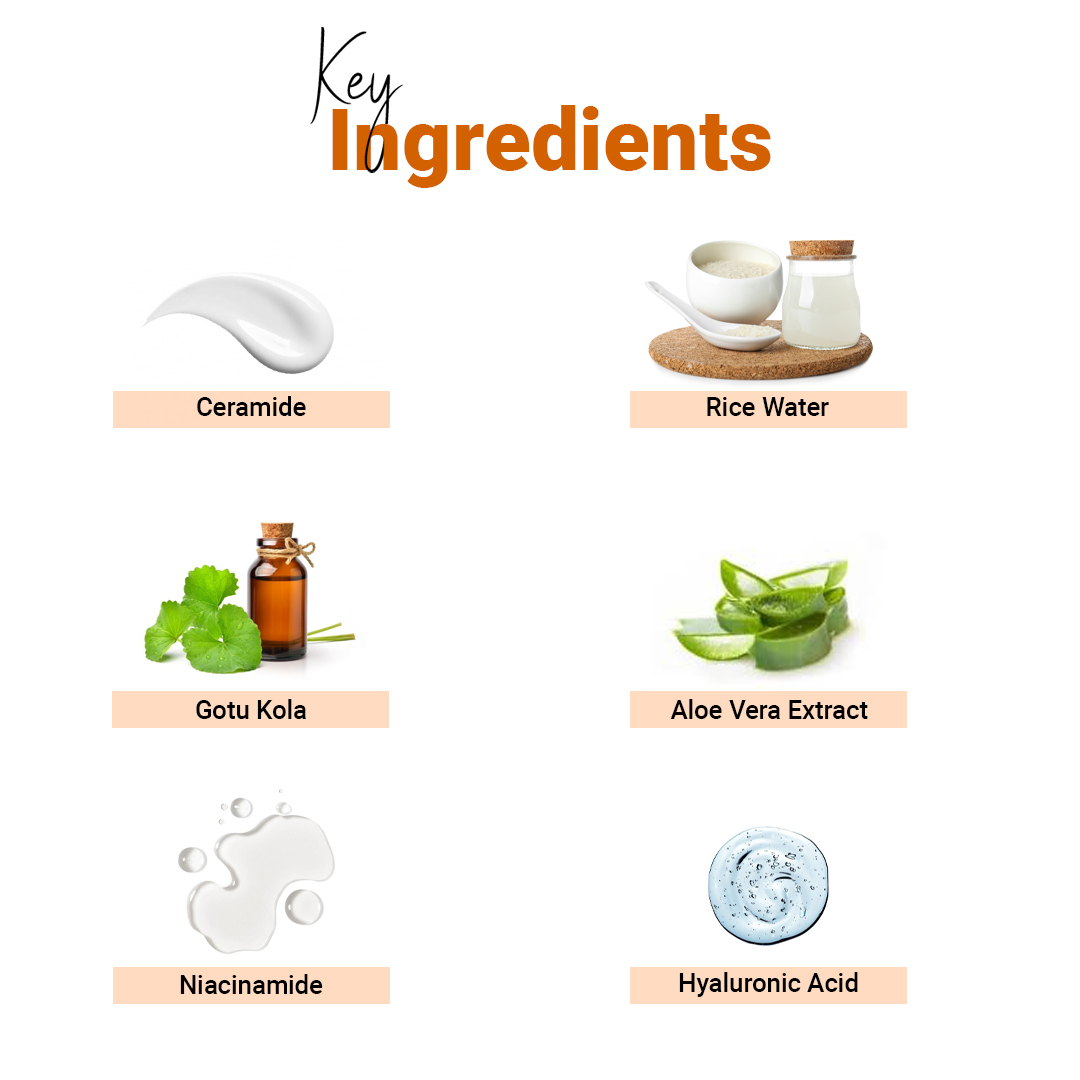 Ingredients: – Aqua, Aloe Barbadensis Leaf Extract, Glycerin, Phenoxyethanol,Triethanolamine, Acrylates/C10-30 Alkyl Acrylate Crosspolymer, Urea, Oryza Sativa (Rice) Water, Ceramide Complex, Allantoin, Centella Asiatica (Gotu Kola) Extract, Sodium Benzoate, Potassium Sorbate, Niacinamide, Sodium