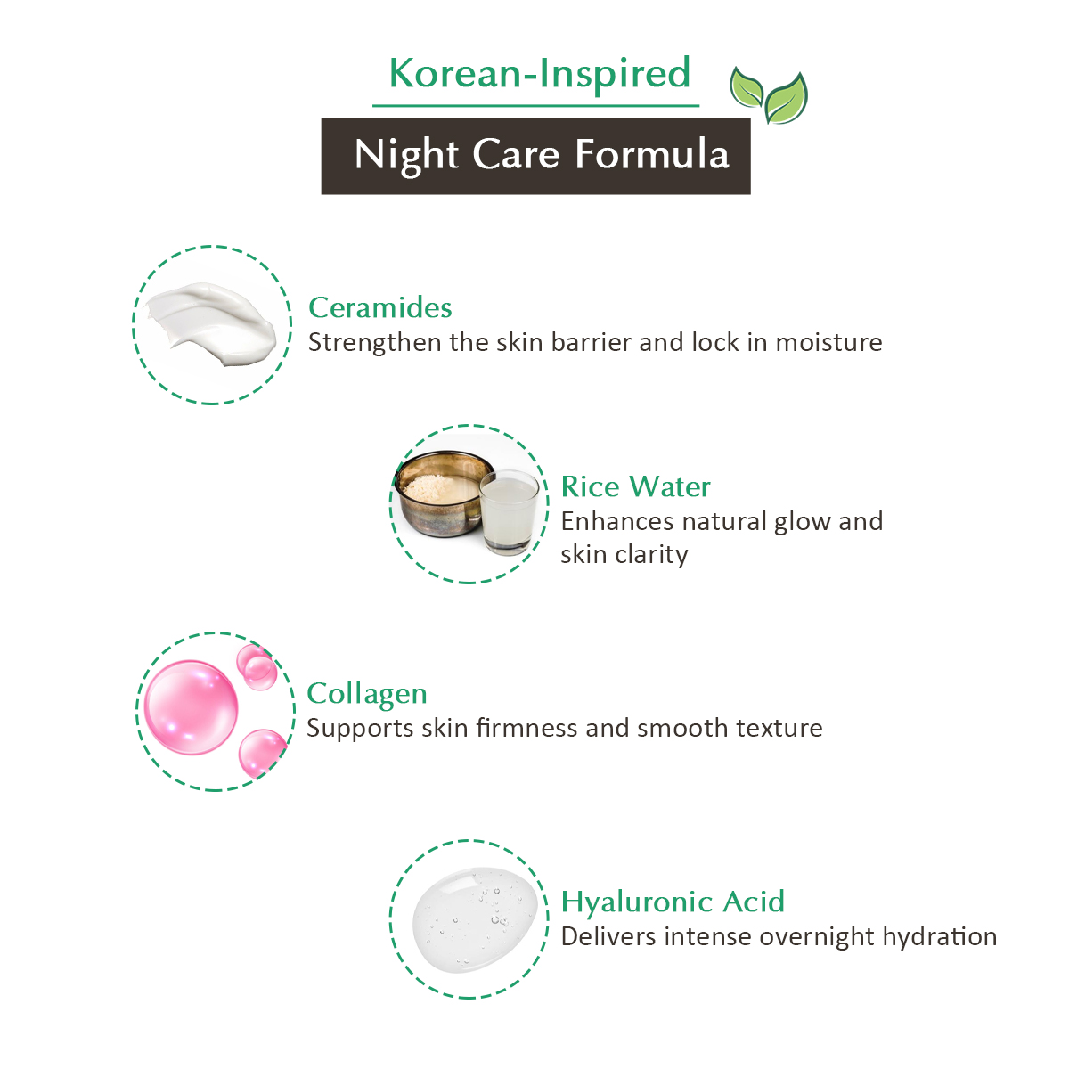 Rice Water is known for its ability to support brighter, smoother-looking skin by providing essential nutrients that enhance skin clarity. Ceramides help rebuild the skin’s protective barrier, reducing moisture loss and supporting skin resilience throughout the night.