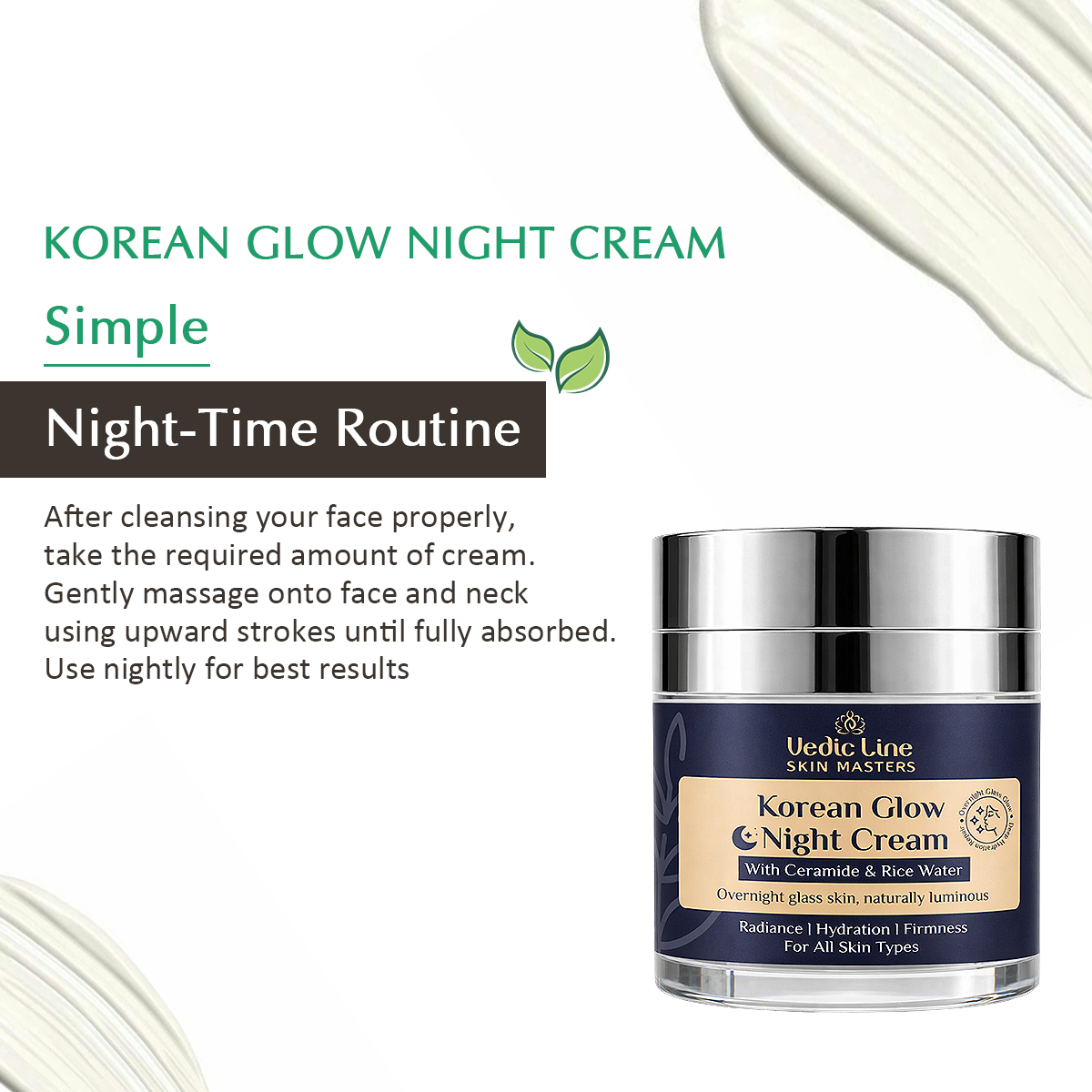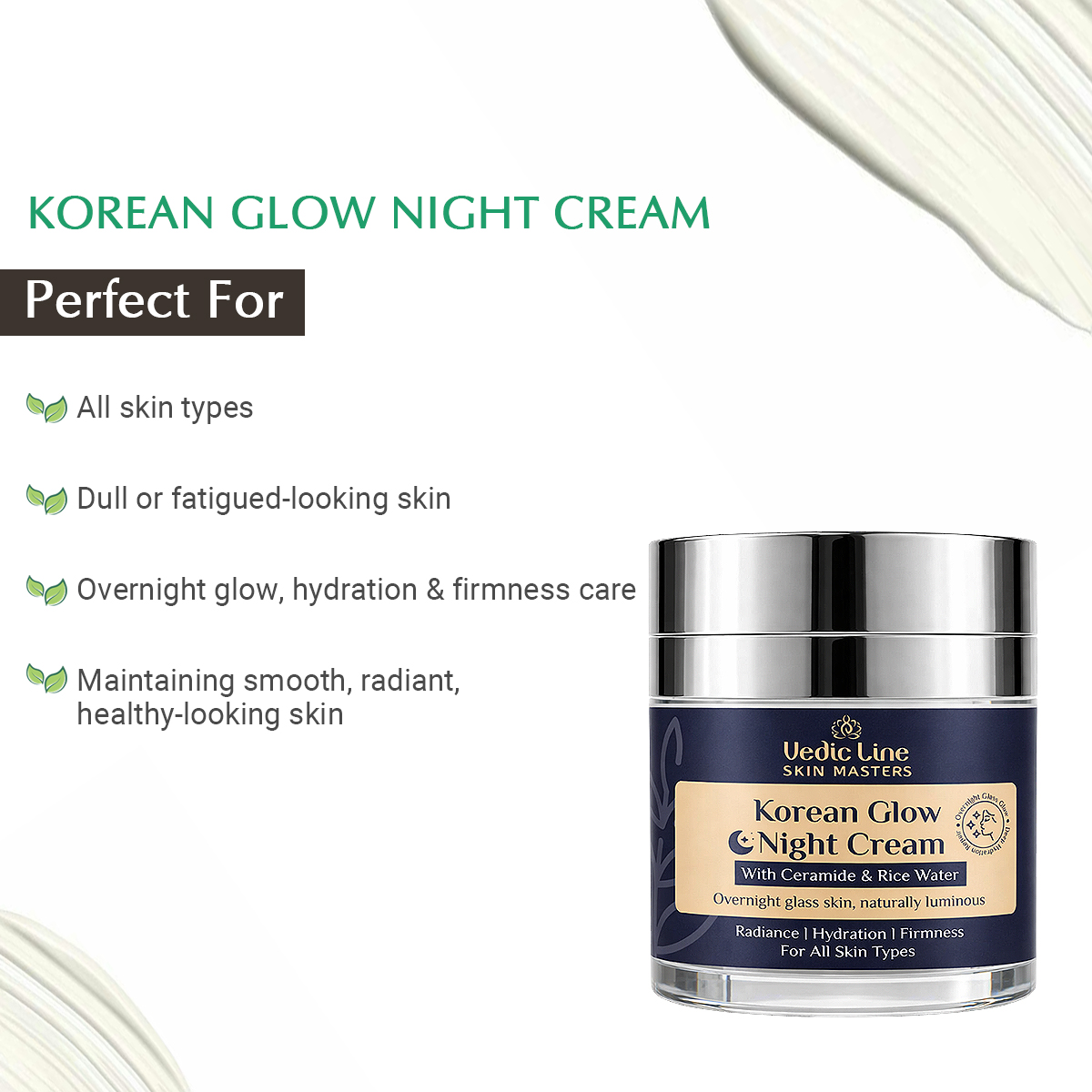 Wake up to nourished, glowing skin with Vedicline Korean Glow Night Cream, a deeply moisturizing overnight formula that repairs and rejuvenates skin while you sleep. Enriched with Ceramide and Rice Water, this night cream helps restore moisture balance and improve skin’s natural radiance.