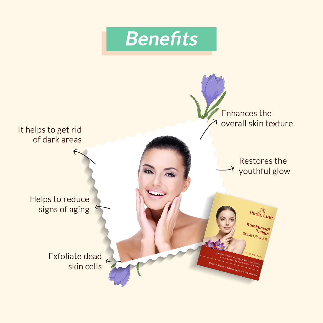 Enjoy glowing & dazzling skin with the Kumkumadi Tailam Bridal Glow Kit. This kit contains Kumkumadi Tailam Ubtan Face wash, Kumkumadi Tailam Massage Cream, Kumkumadi Tailam Massage Gel, Kumkumadi Tailam Cryo Mask, and Kumkumadi Tailam Face Serum. This professional treatment will help deep clean pores, remove impurities, and fade blemishes. Also, it helps detoxify the skin and build immunity against pollution.