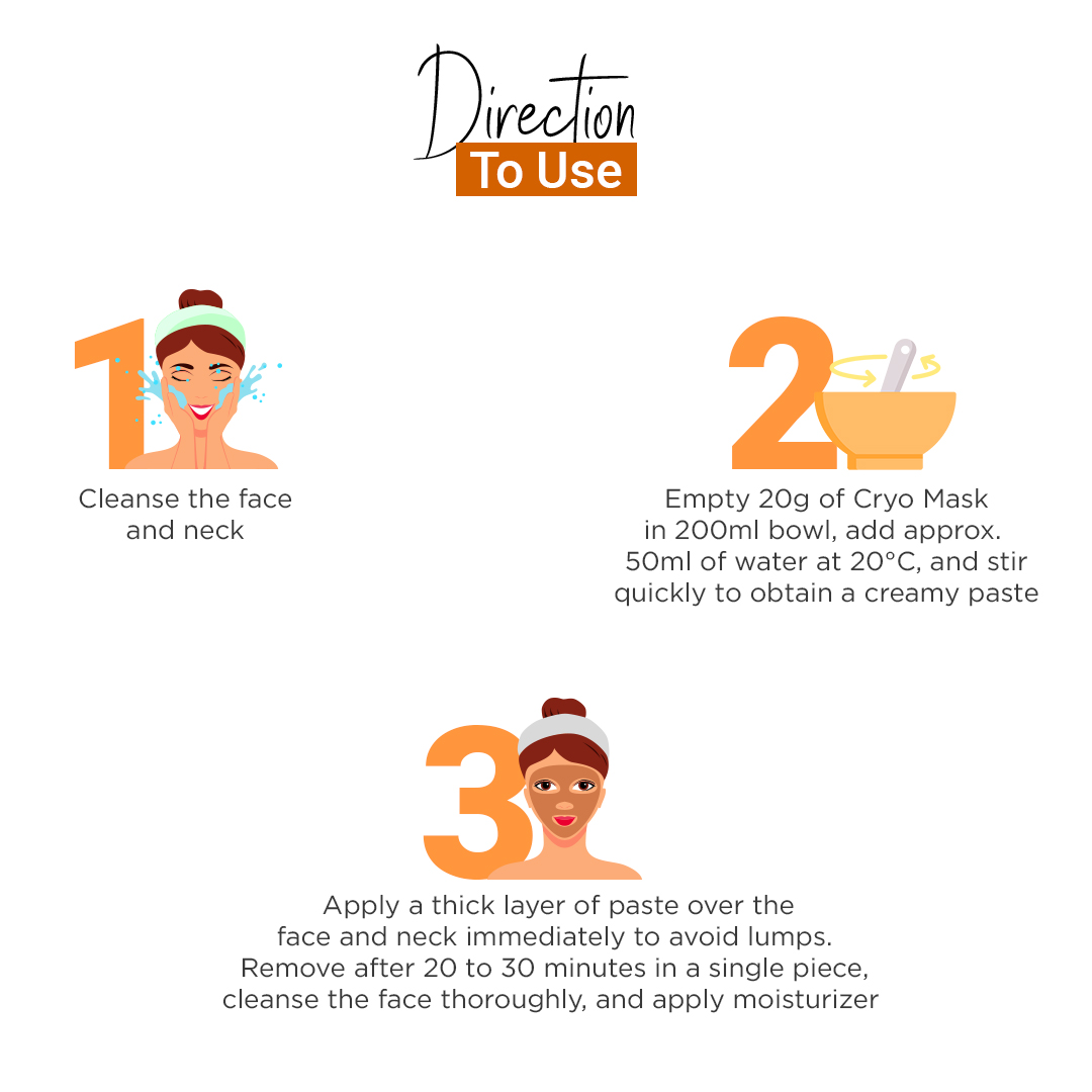 - Empty 20g of Cryo Mask in 200ml bowl, add approx. 50ml of water at 20°C, and stir quickly to obtain a creamy paste