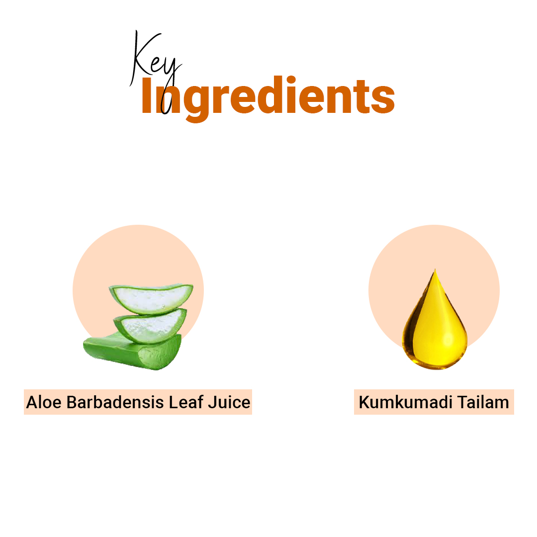 Moreover, complementing Kumkumadi Tailam is Aloe Barbadensis Leaf Juice, a natural powerhouse known for its soothing and hydrating properties. Specifically, this ingredient locks in moisture, ensuring your skin remains soft, supple, and free from dryness. Additionally, Aloe also helps calm irritation, making it suitable for all skin types, including sensitive skin.