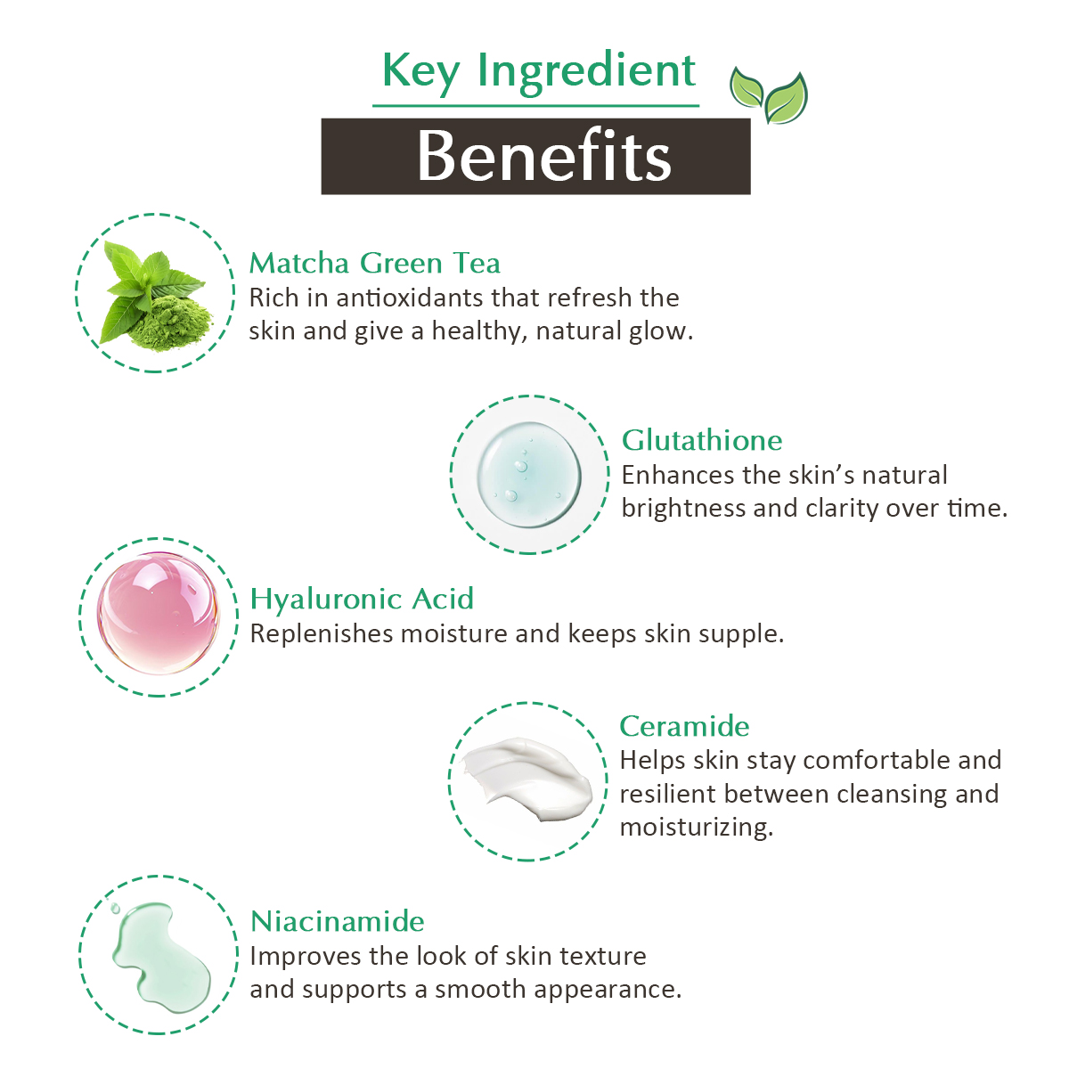 Matcha Green Tea helps calm the skin and refresh a dull, tired complexion, while Glutathione is known for supporting a brighter and more even appearance. Hyaluronic Acid deeply hydrates by attracting and retaining moisture, and Ceramides help strengthen the skin barrier.