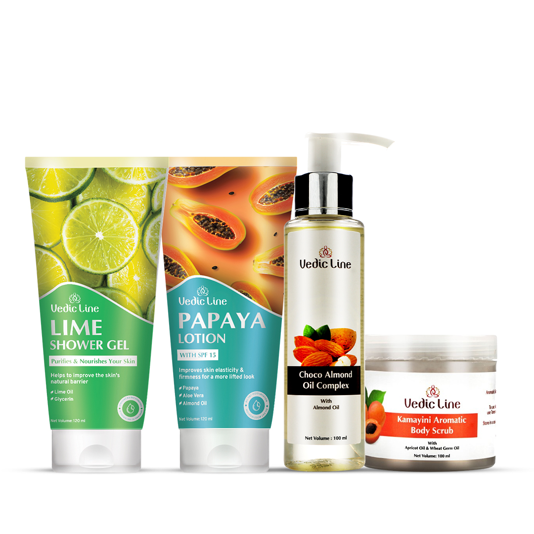Papaya Lotion acts as a natural sunscreen that blocks UVA and UVB radiation. It inhibits skin tanning and offers long-lasting beauty due to the harmful effects of sunlight. Choco Almond Oil Complex minimizes cellulite and helps in cell recovery. As a result, it reduces noticeable skin damage and combats free radicals. Kamayani Aromatic Body Scrub gives your face a healthy shine, minimizes tanning, evens out skin tone, and shields skin from pollution, debris, and dust by making it soft, smooth, and supple.