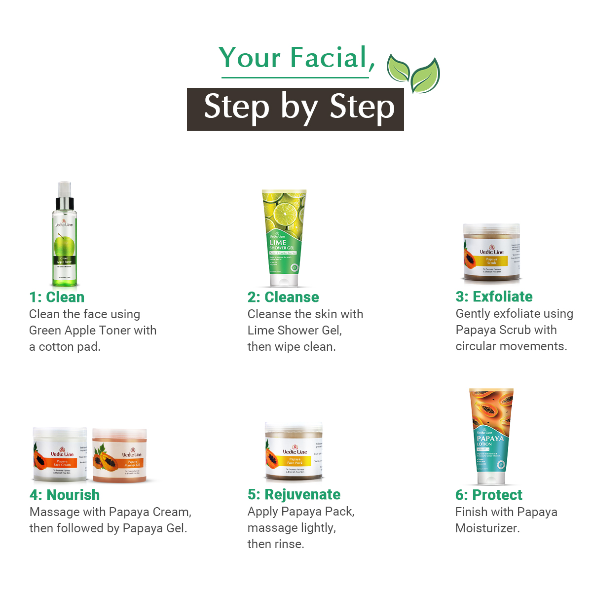 Step 5 : Rejuvenate- With Papaya Pack, when semi dry, spray Toner, lightly massage & clean it.