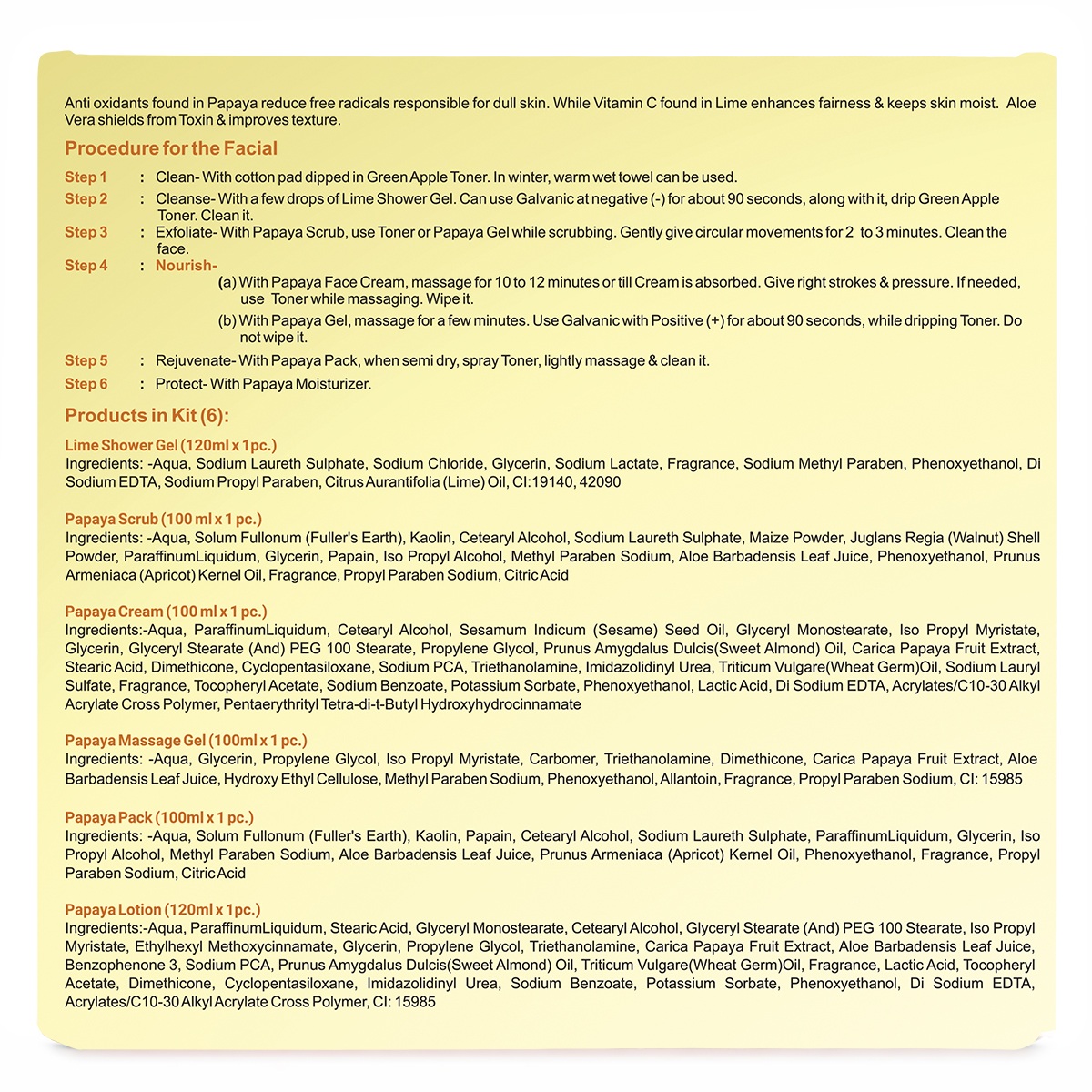 Together, the Papaya & Lime Facial Kit offers a complete skincare routine that cleanses, exfoliates, hydrates, and brightens. This kit is perfect for those seeking smooth, glowing, and rejuvenated skin, providing a natural and refreshing glow with every use.