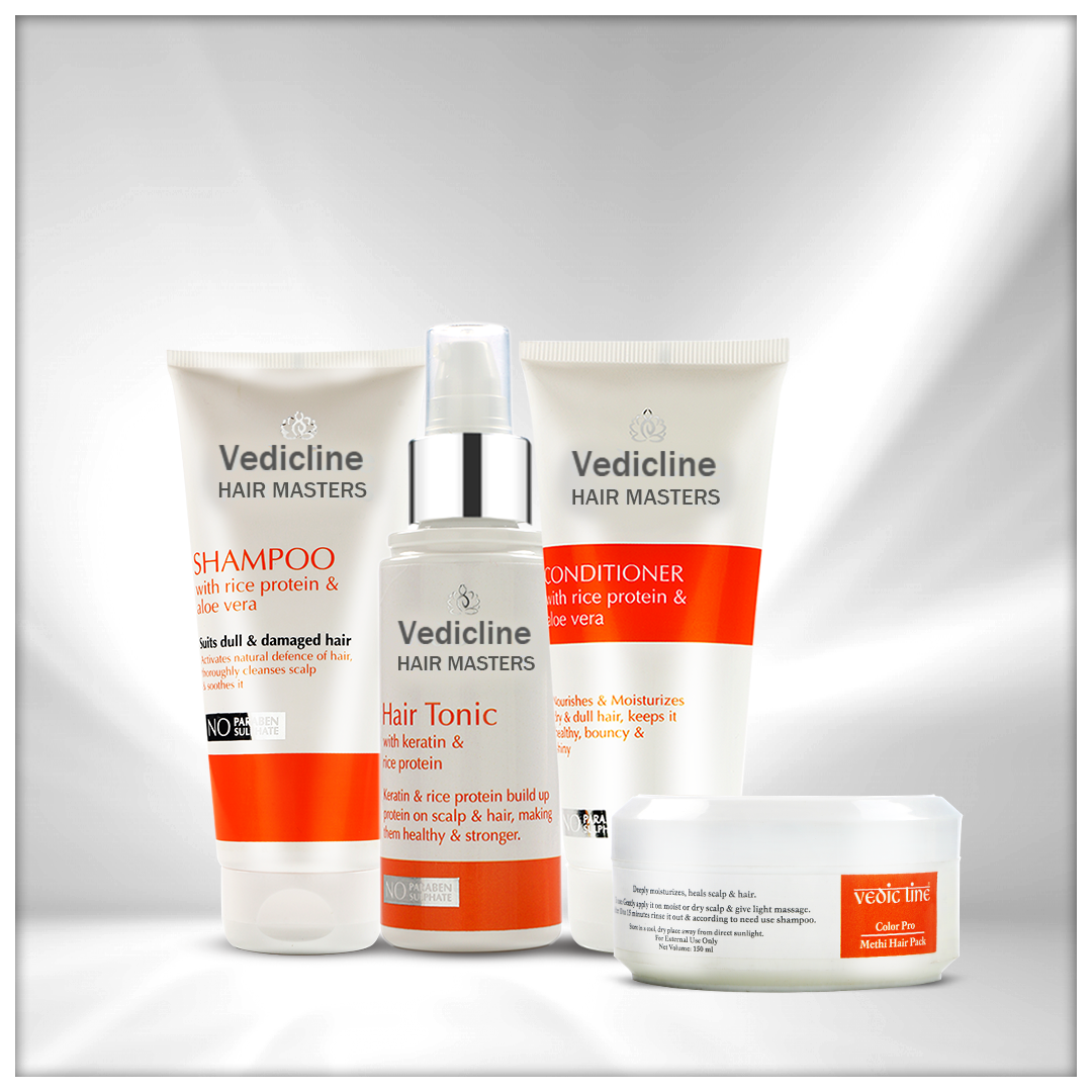 Vedicline Fasten Hair Growth Kit, a breakthrough hair care solution design to stimulate rapid hair growth while nourishing and strengthening each strand from root to tip. This comprehensive kit combines the power of nature and advanced science to address hair fall and promote healthier, fuller hair. Each product in the kit is infused with high-performance ingredients like Rice Protein, Aloe Vera, Keratin, and Methi, ensuring that your hair receives the ultimate care it deserves.